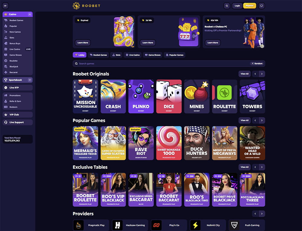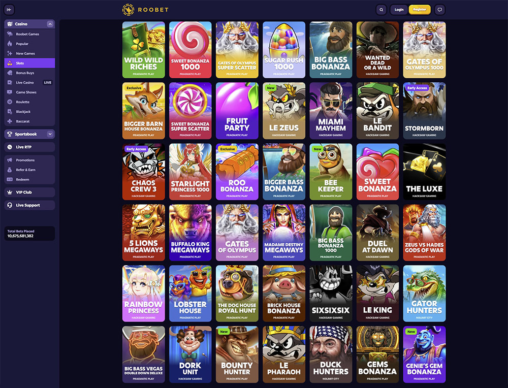 Roobet میں تقریباً 4500+ جوئے بازی کے اڈوں کے کھیل دستیاب ہیں جو مختلف کیٹیگریز جیسے سلاٹ, ٹیبل گیمز, آرکیڈ, سکریچ کارڈز, اور بنگو پر مشتمل ہیں۔ اگرچہ کھیلوں کے شرط لگانے اور پوکَر جیسے کچھ ویریئنٹس بھی موجود ہیں، Roobet کا سب سے بڑا مزہ اس کی سلاٹ اور لائیو ٹیبلز کی ورائٹی ہے۔ صارف کو یہ بھی معلوم ہوگا کہ RTP، ڈیپازٹ بونس، لائیو کیسینو کے تجربے اور کھیل فراہم کرنے والے سوفٹ ویئر پر تفصیلی تبصرہ کیا جائے گا، تاکہ آپ جان سکیں کہ یہ سائٹ کس قسم کے کھلاڑیوں کے لیے موزوں ہے۔